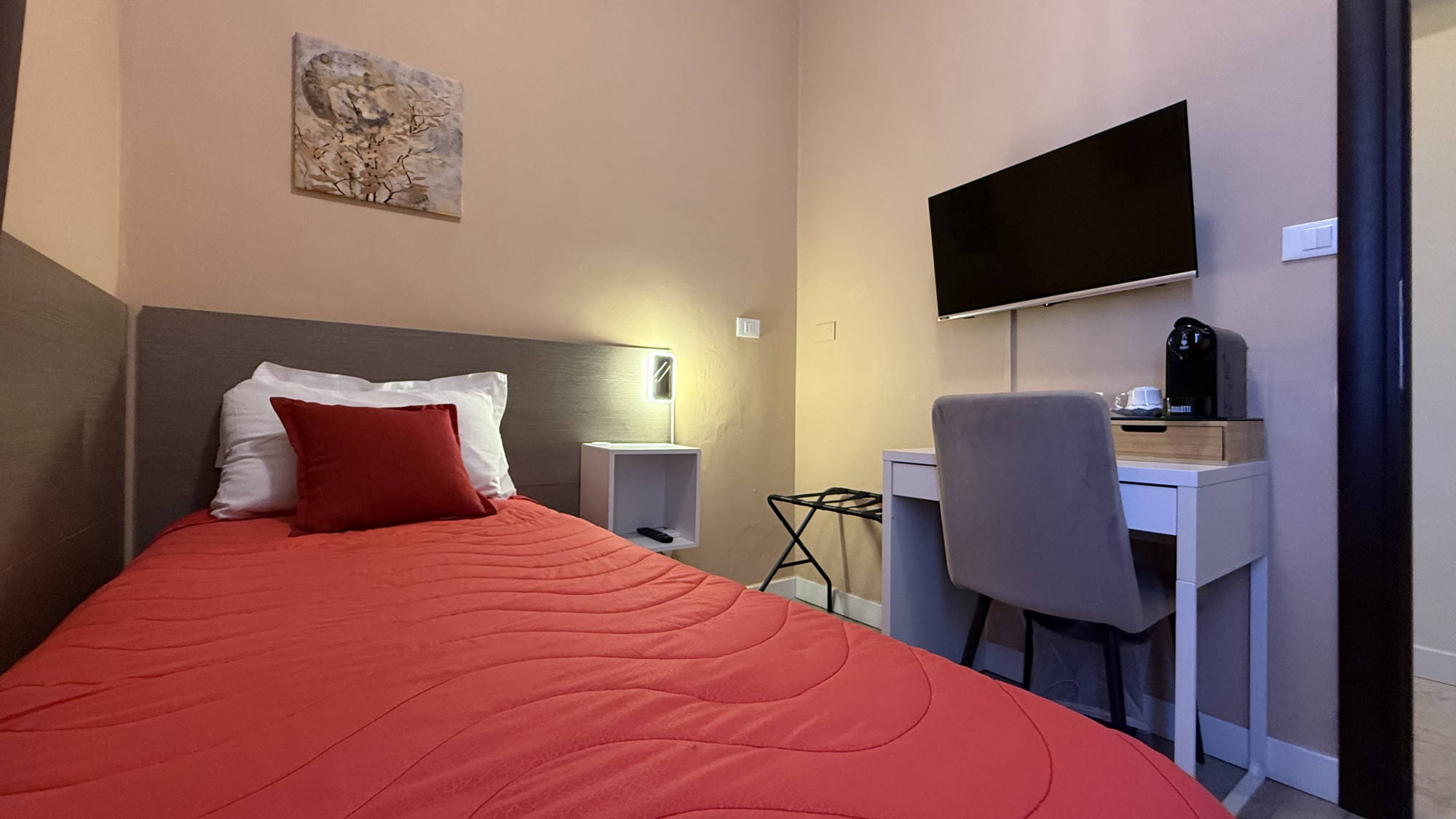 Camera progettata per un solo ospite, ideale per viaggiatori singoli, business o brevi soggiorni. Include  un letto singolo, bagno privato, scrivania, TV,  climatizzatore Wi-Fi e servizi essenziali.